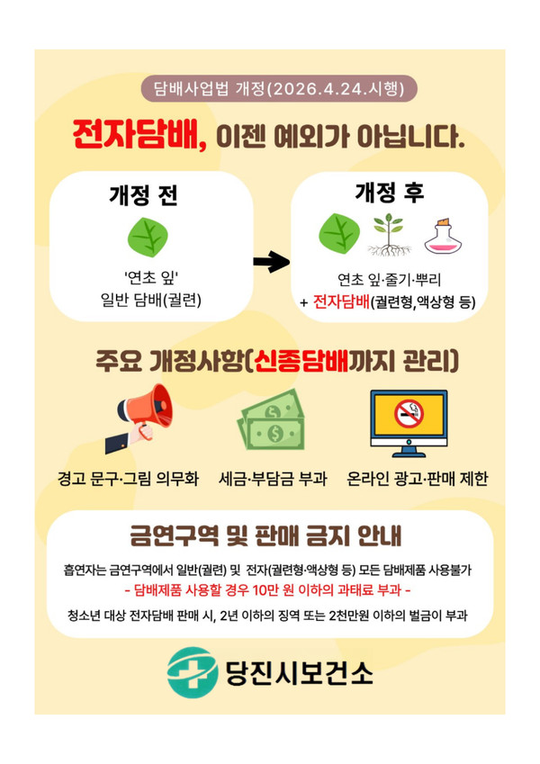 당진시보건소는 담배사업법 개정에 따라 개정된 법령을 홍보하고 주민들의 혼선을 최소화 하기 위해 4월 24일부터 5월 13일까지 3주간 집중 홍보, 단속기간을 운영할 예정이며, 전자담배를 포함한 금연구역 내 흡연 여부를 점검할 예정이다.